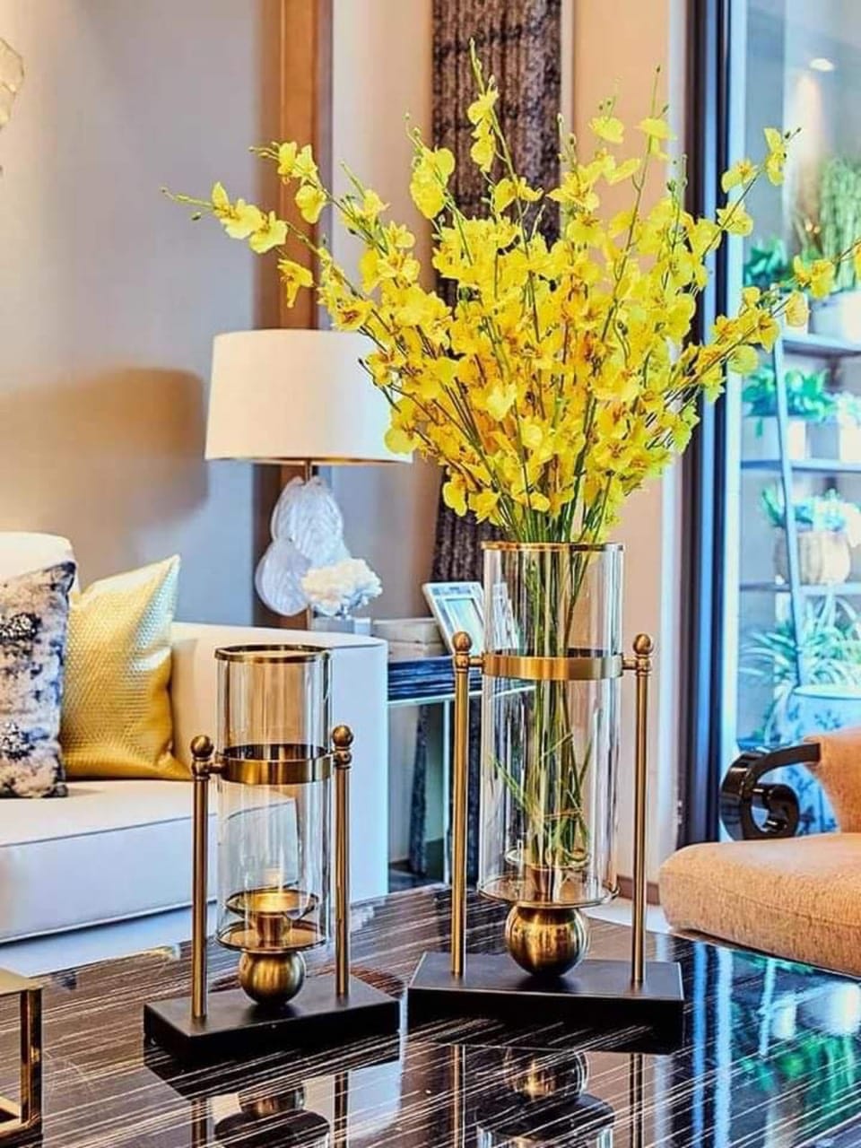 ► Màu sắc sản phẩm: thân bình thủy tinh màu vàng hổ phách, chân trụ và đế bình bằng sắt sơn tĩnh điện mạ vàng sang trọng
