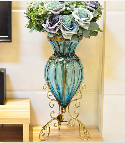 Mẫu bình cắm hoa thủy tinh xanh ngọc chân sắt mỹ thuật phong cách Châu Âu