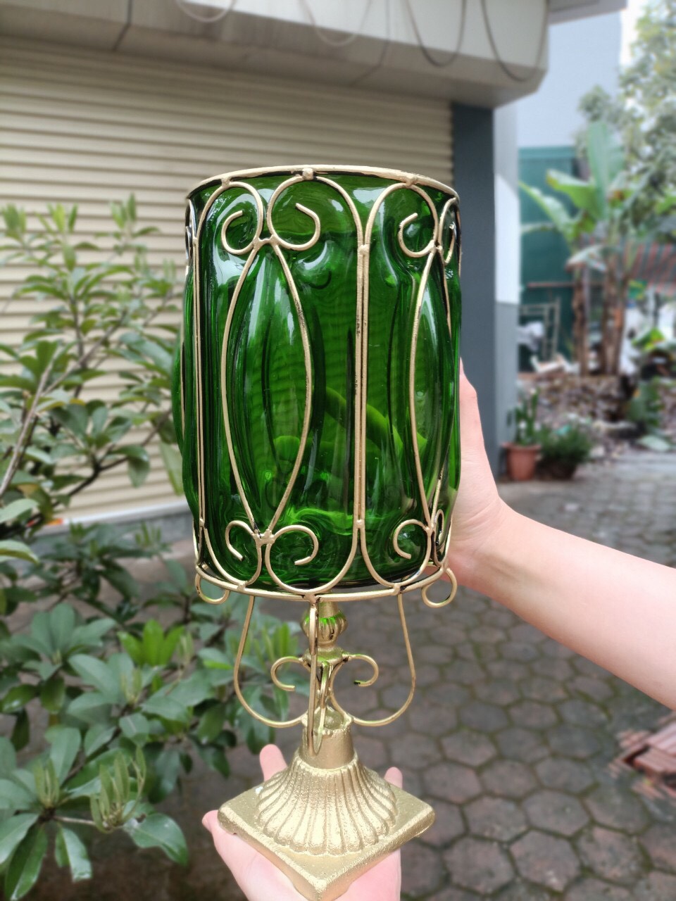 Bình cắm hoa thủy tinh xanh ngọc chân sắt mỹ thuật hoa văn cổ điển