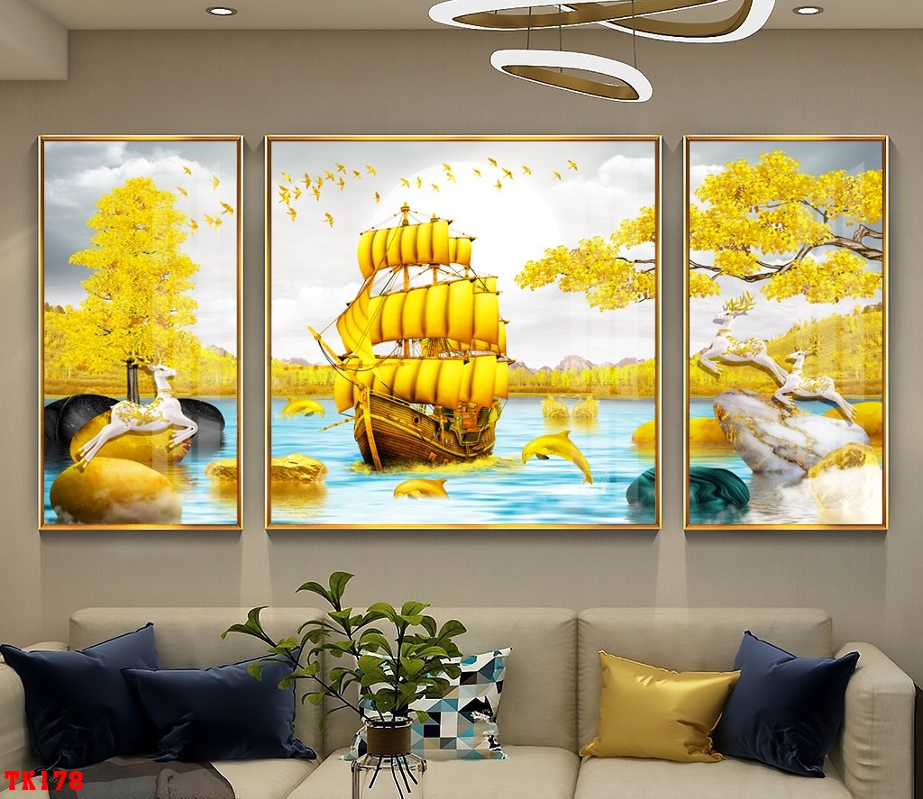 - Bộ sản phẩm: gồm 03 tranh theo kích thước và mô tả như trên cùng phụ kiện đi kèm (đinh treo 3 chân hoặc đinh sắt, vít nở...).
